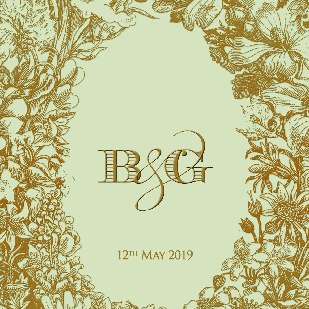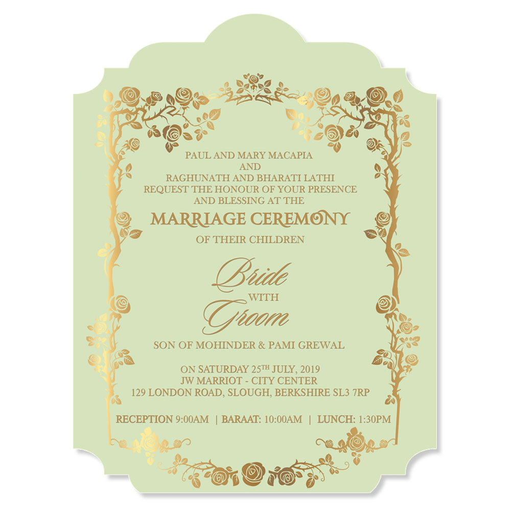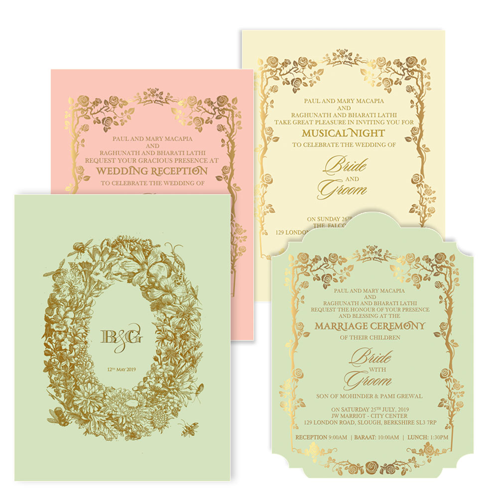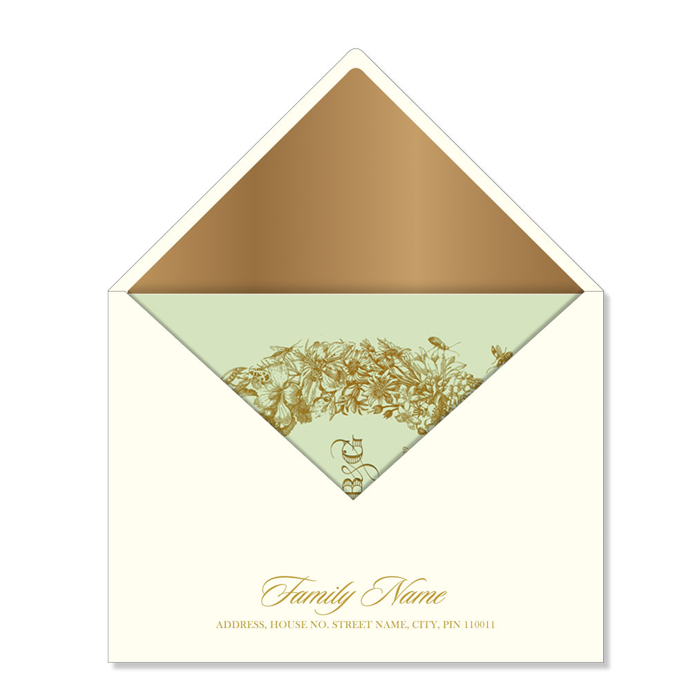 The wedding invitation suite comes with 3 inserts in pastel shades and 1 signature jacket. The signature Nouveau jacket in powder green is imprinted with huge and cheerful floral crest embossed with gold detailing. The inserts in powder green, Naples yellow and powder pink are imprinted with classic golden floral rim encompassing exotic flowers, twigs and leaves. The fonts and script in classic gold adds to the grandeur of the French zest. The invitation suite comes in a classic Oyster envelope.
