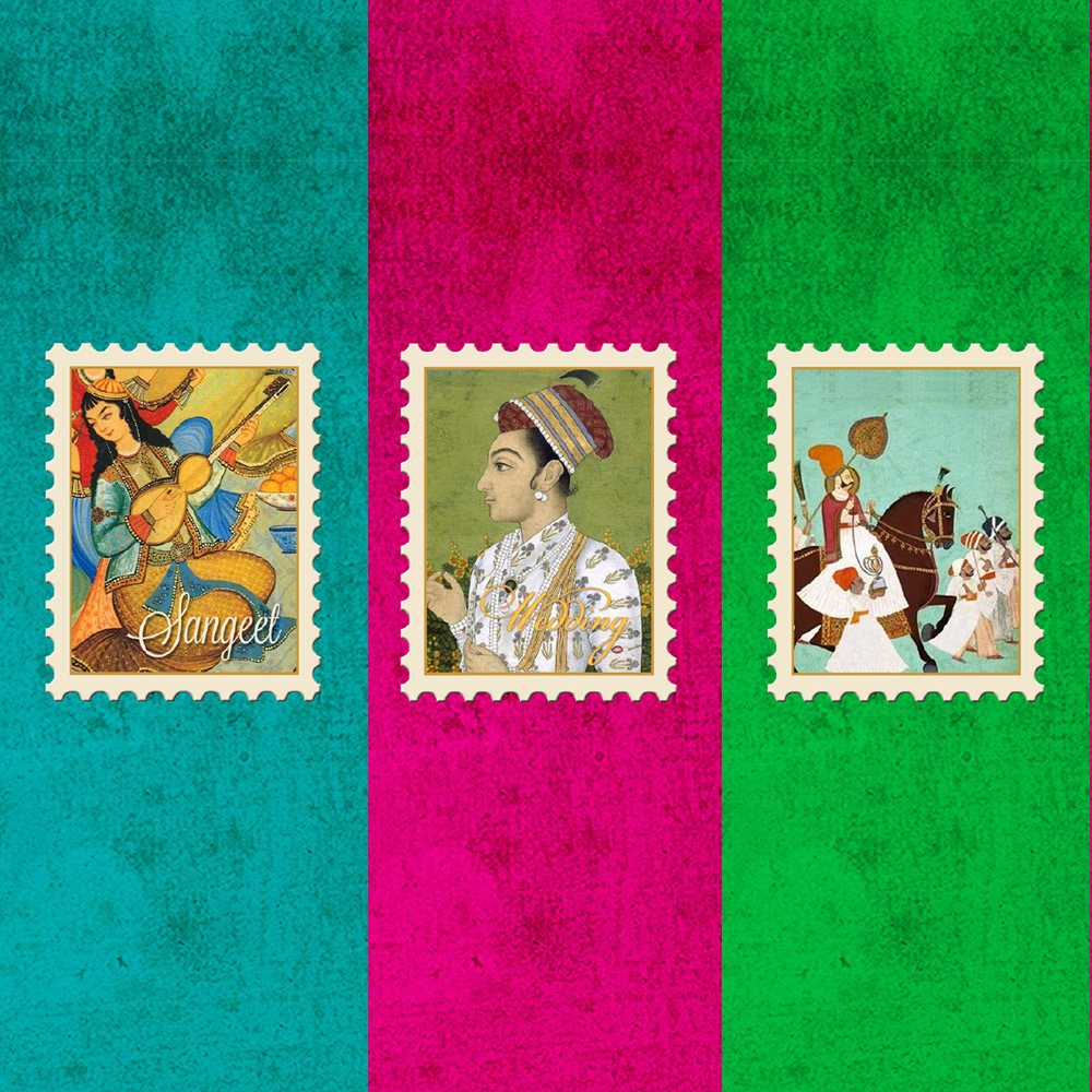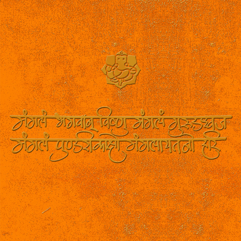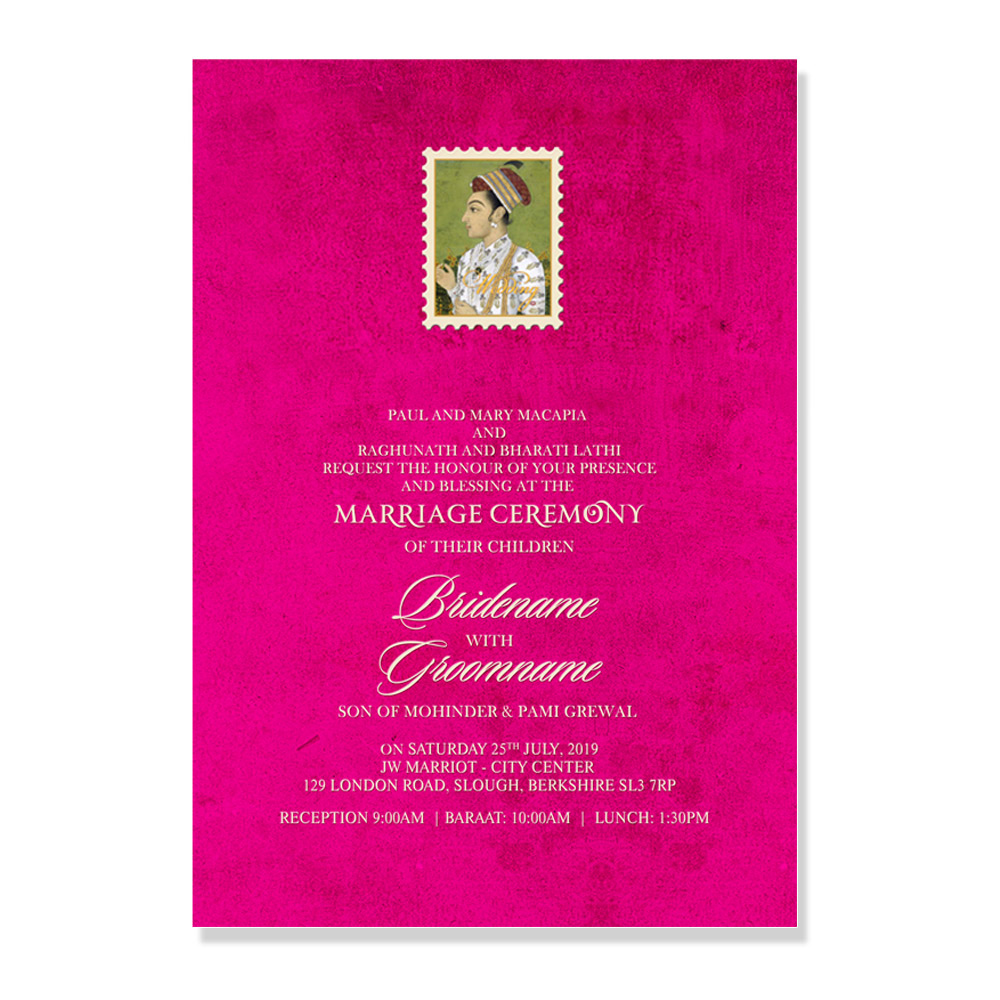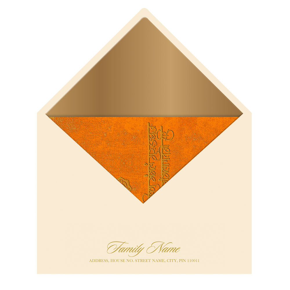 The Traditional vow wedding invitation suite comes with 3 colorful inserts and 1 signature jacket. The signature amber orange jacket is imprinted with a pious script from Indian Mythology. The inserts in jade green, crimson red and cosmic blue are imprinted with stamp imprints of miniature images. The pure white fonts on the inserts give a complete contrast color scheme to the Traditional vow wedding invitation collection. The collection comes in an oyster envelope.