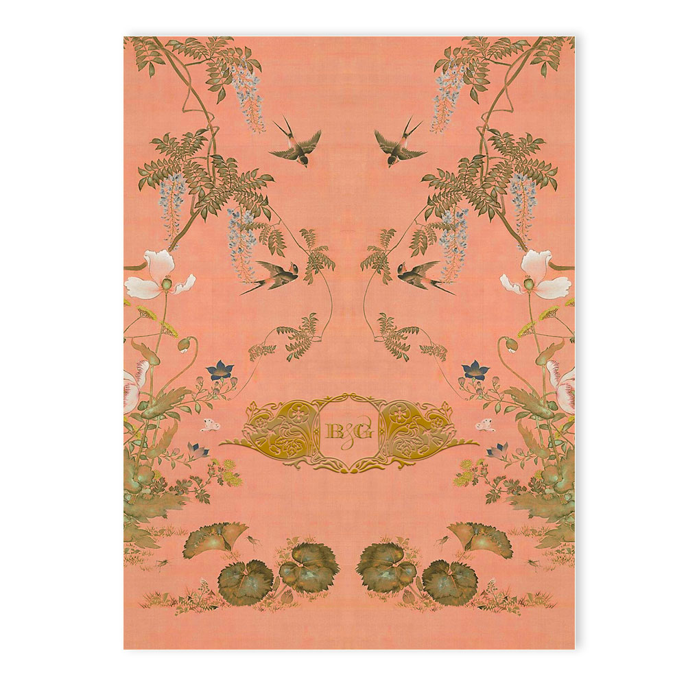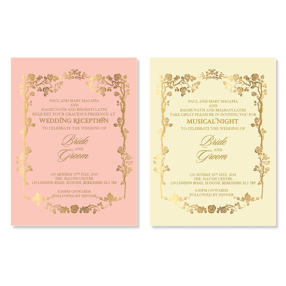 The wedding suite comes with 3 inserts in pastel shades and 1 signature jacket. The signature jacket in subtle mandarin shade is imprinted with Chinoiserie elements. The inserts in powder green, powder pink and Waterbury cream are imprinted with floral twigs in dust gold. The fonts and script in classic gold adds to the essence of the Oriental culture. The invitation suite comes in a classic Oyster envelope.