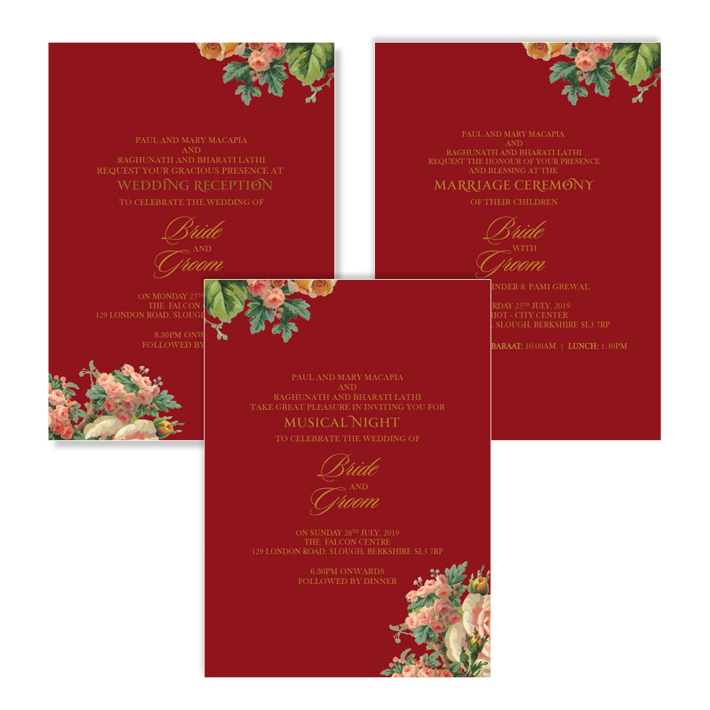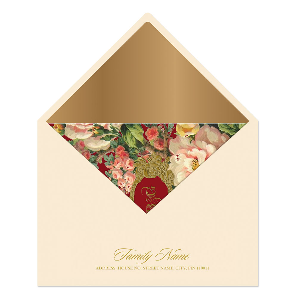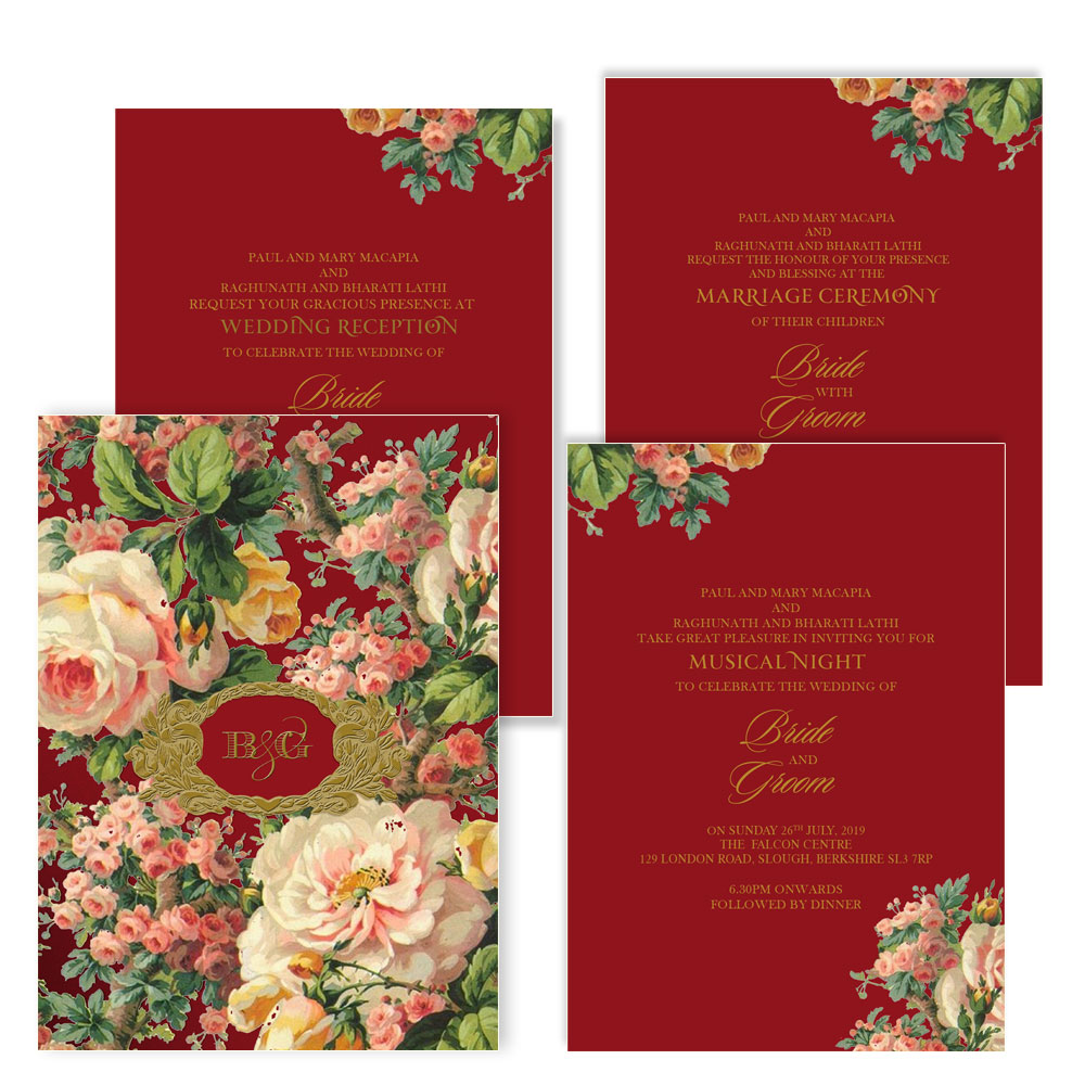 The Victorian blooms wedding invitation suite comes with 3 inserts in royal red and 1 signature jacket. The signature jacket is imprinted with patterns of English floral on a backdrop of royal red. The inserts are again in royal red imprinted with floral motifs on the right hand corner. The fonts and script in classic gold adds to the grandeur of the British legacy. The invitation suite comes in a classic white envelope.